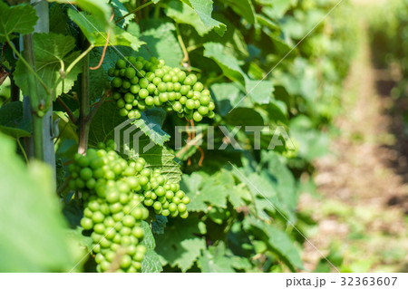 Close up vine green grape in champagne vineyards at montagne de reims countryside village background, Reims, France