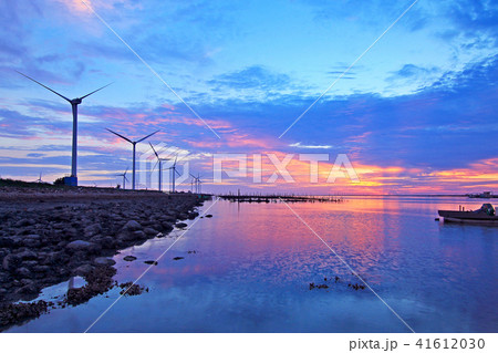 Kyan北路漁港,日落,竹筏,台灣,彰化,長港,海水,風力發電,Ai寺,Sai Nada,海的一種顏色