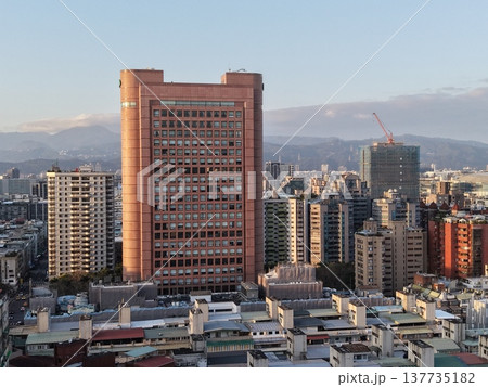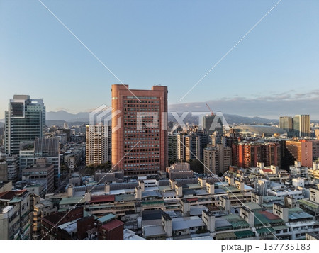 黃昏時分,從空中俯瞰一座城市公園和摩天輪。