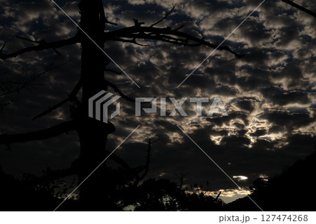 透過雲層照射下來的夕陽,照亮了城市景觀。公園裡烏桕樹的輪廓,以及烏雲下的晚霞天空。