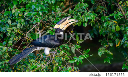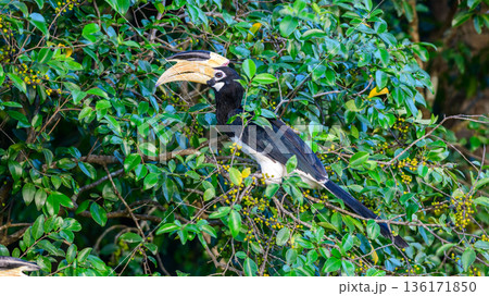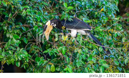 Hungry Malabar pied hornbill perches among dense green foliage and feeds on wild fruit in Udawalawe National Park, Sri Lanka