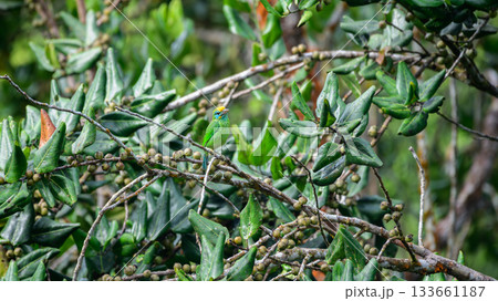 Yellow-fronted barbet is perched on a fruiting tree branch in the Sinharaja Forest Reserve. Surrounded by green leaves and small fruits in the rainforest habitat