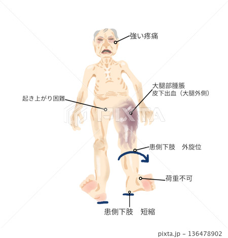 股骨大轉子骨折的身體檢查結果 | 圖示外旋、縮短、皮下出血和起床困難