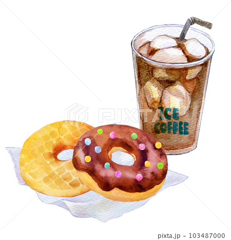 甜甜圈和冰咖啡水彩插圖
