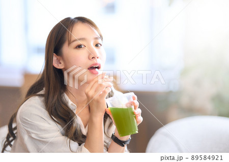 年輕女子用吸管喝蔬菜汁
