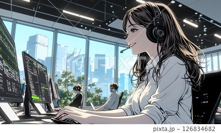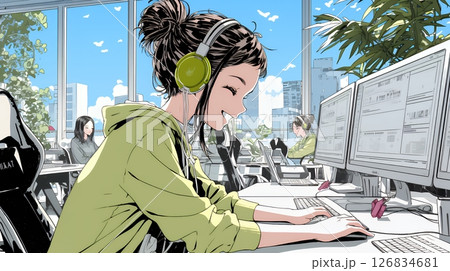 在現代呼叫中心辦公室工作的女性接線員(簡單的顏色使用)