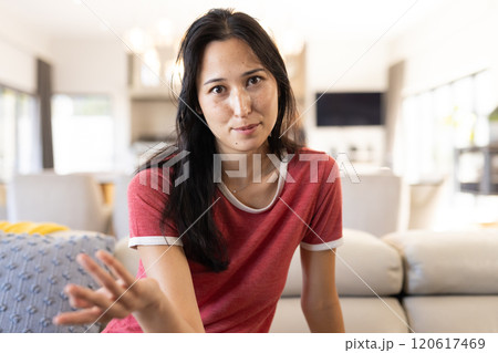 On video call, Woman in casual red shirt gesturing while sitting on couch in living room, at home