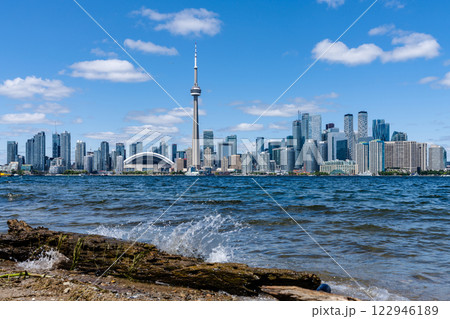 從前往加拿大多倫多島(安大略湖、加拿大國家電視塔、市中心)的渡輪上眺望