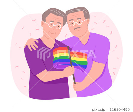 Senior Gay Men Couple Holding the LGBT Rainbow Flag for Gay Pride Celebration Concept Illustration