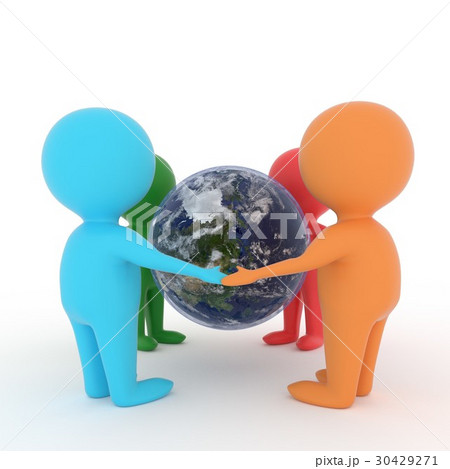 small people holding hands around earth planet