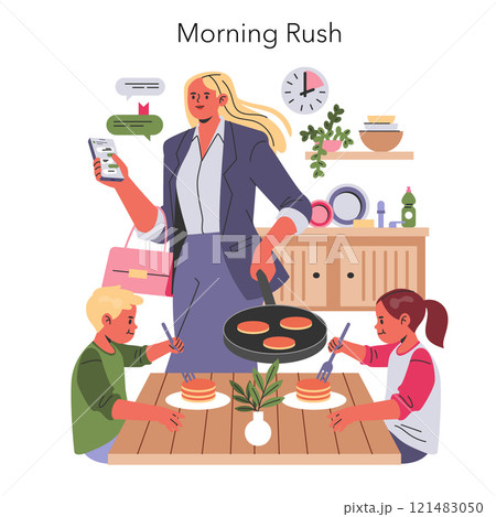 Working Mom Life concept. A multitasking mother prepares breakfast with her kids while managing work tasks on her smartphone. Vector illustration.
