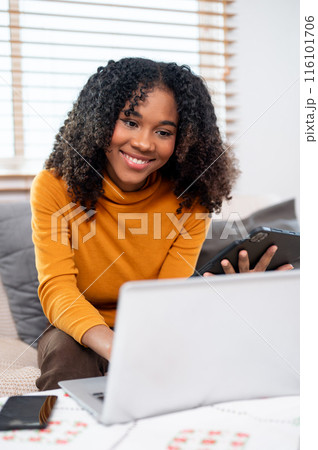 Asian woman working at home, Press the calculator to calculate the income - expenses of the house and use the laptop to record the information and check the accuracy, Home lifestyle.