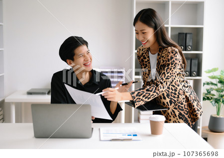 Two Asian business man and woman workers talking on the smartphone and using laptop Professionals in Teamwork Finance, Marketing, and Success