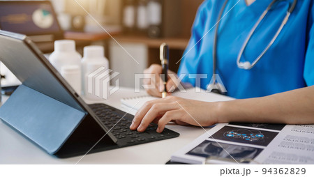 Medical technology concept. Doctor working with tablet keyboard mobile phone and stethoscope