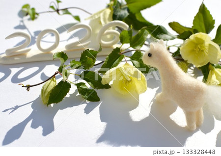 羊毛氈白馬和冬季盛開的鐵線蓮新年圖案