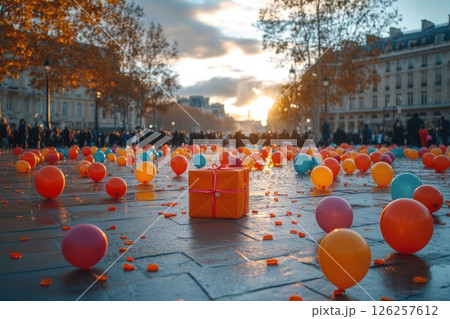 A box with a red ribbon sits in the middle of a pile of balloons