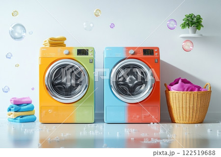 Two colorful washing machines with a basket of towels in the background