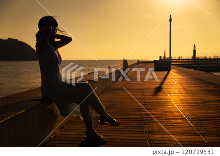 港口的日落和女人的剪影