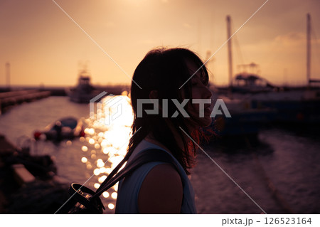 在港口看日落的女人