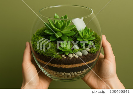 Hands holding glass bowl terrarium with layered soil, moss, pebbles, and green succulents, creating eco friendly indoor garden