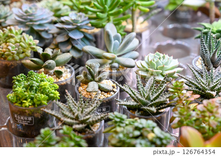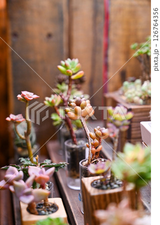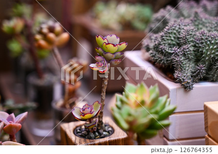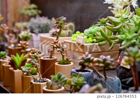 植物商店的木架上陳列著各種顏色、混合圖案的盆景多肉植物,以及帶有醒目葉子的日本手工製作的容器。