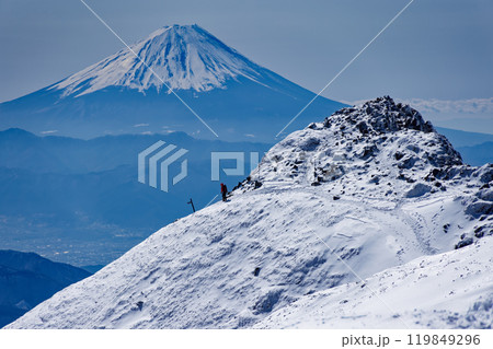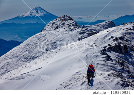 嚴冬中,登山者沿著八嶽山脈的橫嶽山脊線行走,欣賞富士山的景色
