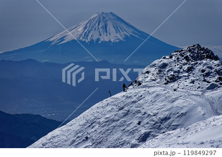 嚴冬時節,從八嶽山脈的赤嶽山眺望龍頭峰和富士山