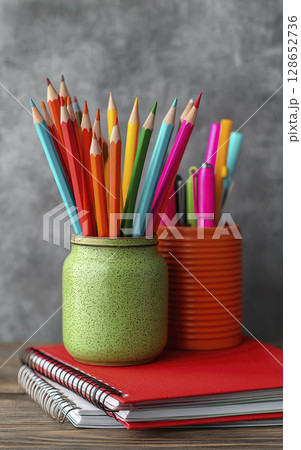 Colorful pencils and stationery ceramic and plastic containers notebooks vibrant and organized workspace creative and inspiring environment bright colors wooden surface textured background school