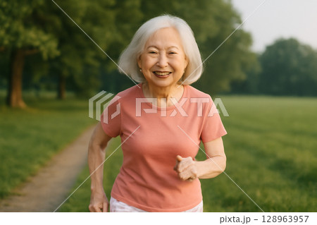 AI generated image of an elderly Asian woman jogging in a park with a bright smile. She wears athletic clothes and enjoys a peaceful moment under the soft morning sunlight, radiating vitality and joy.