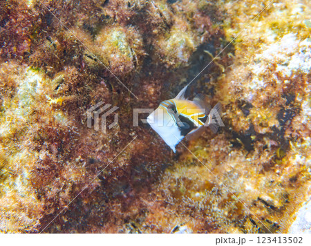水下洞穴中的一隻可愛的幼年箱魚(箱魚家族)。 靜岡縣伊豆半島加茂郡南伊豆町中木広濱2024