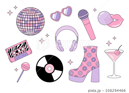 Disco ball doodle line tattoo y2k coquette trendy groovy decoration set. Retro dance party line hand drawn design elements. Disco ball, flower pot, vinyl with stars, sketch