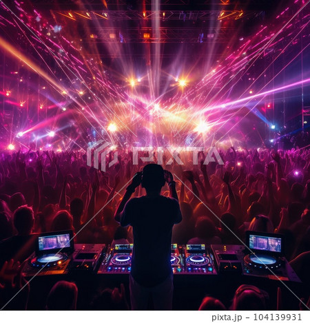 Dj in a nightclub scene with lights and lasers, DJ performing in Live concert or stage in night.