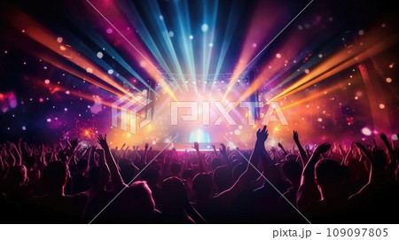 Fun concert party disco light background, Crowd of people at a live event at concert.