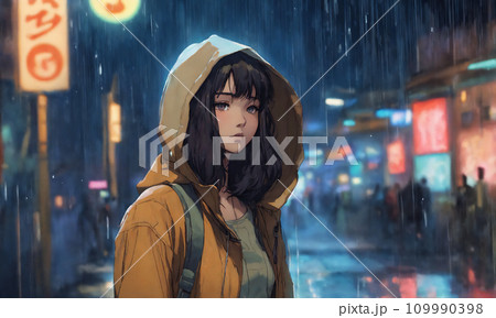 夜城雨中行走的年輕女子,數位插畫,AI 生成影像