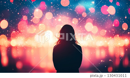 woman with short hair stands in silhouette against vibrant backdrop of colorful lights, New Year celebration. scene evokes feelings of wonder and contemplation