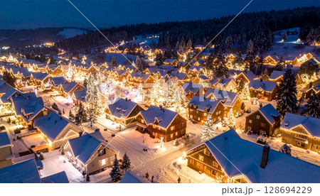 雪夜中聖誕彩燈照亮的城市鳥瞰圖