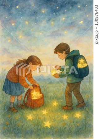 捕捉星星的男孩 河畔夜晚水彩插畫