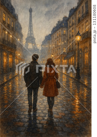 巴黎雨夜情侶手牽手漫步街道 水彩插畫