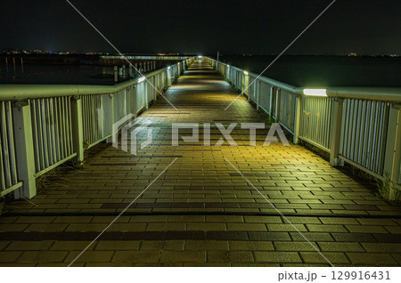 從欄杆被點亮的 Shinji Ohashi 人行道上看到的 Shinji 湖南岸的夜景......島根縣松江市
