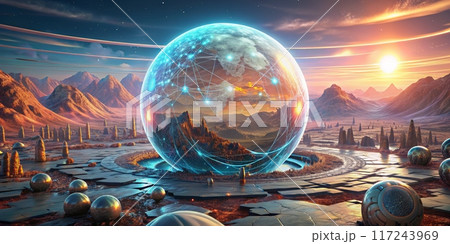 Futuristic Sci-Fi Landscape with a Giant Transparent Sphere and Alien Terrain at Sunset