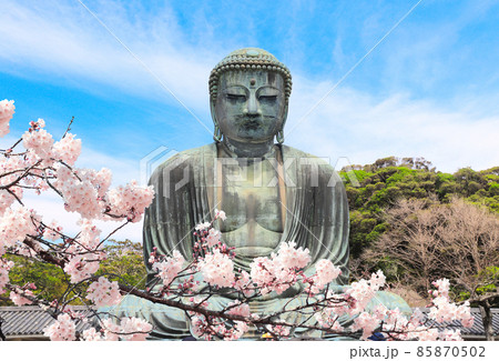 Ancient bronze statue of the Great Buddha Daibutsu and flowers of sakura, Kotoku-in temple, Japan, Asia. Traditional japanese hanami festival. Cherry blossoming season in Japan
