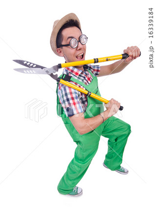Pruning plant with pruning shears on white background, copy space, home garden theme
