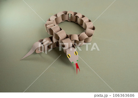 a snake made out of toilet paper on a white surface, craft made of cardboard,