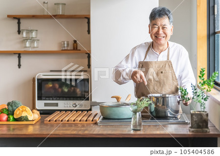 亞洲老人在家裡的廚房裡用鍋煮燉菜(微笑)