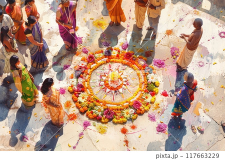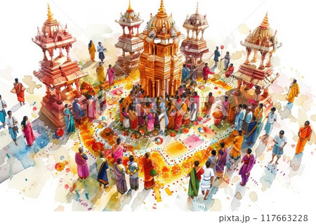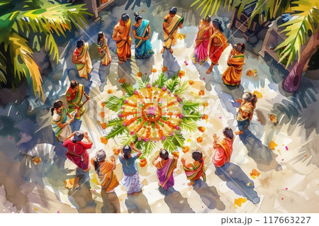 High-angle view of Thaipusam celebration, traditional costumes, vivid decorations, intricate kolam designs, watercolor style, harmonious and festive mood, rich cultural tapestry