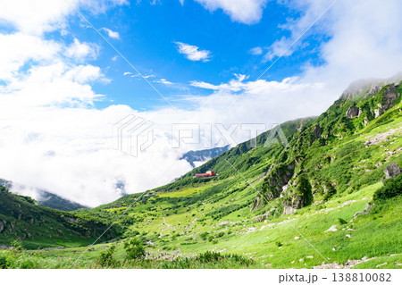 登山者們正在攀登千丈庵冰鬥的八町坡,欣賞壯麗的景色。