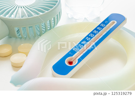 中暑對策商品、空調、風扇等的圖標集,線黑