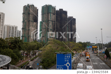 exterior of Wang Fuk Court after the fatal blaze in TaiPo, is where a No.5 alarm blaze caused by substandard net on Nov 26 claimed 159 lives