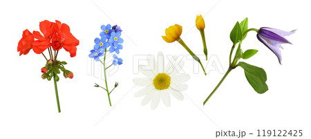 Set of lowers and buds (clematis, geranium, daisy, forget-me-not, buttercup) isolated