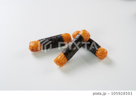 白色背景的醬油米餅和綠茶